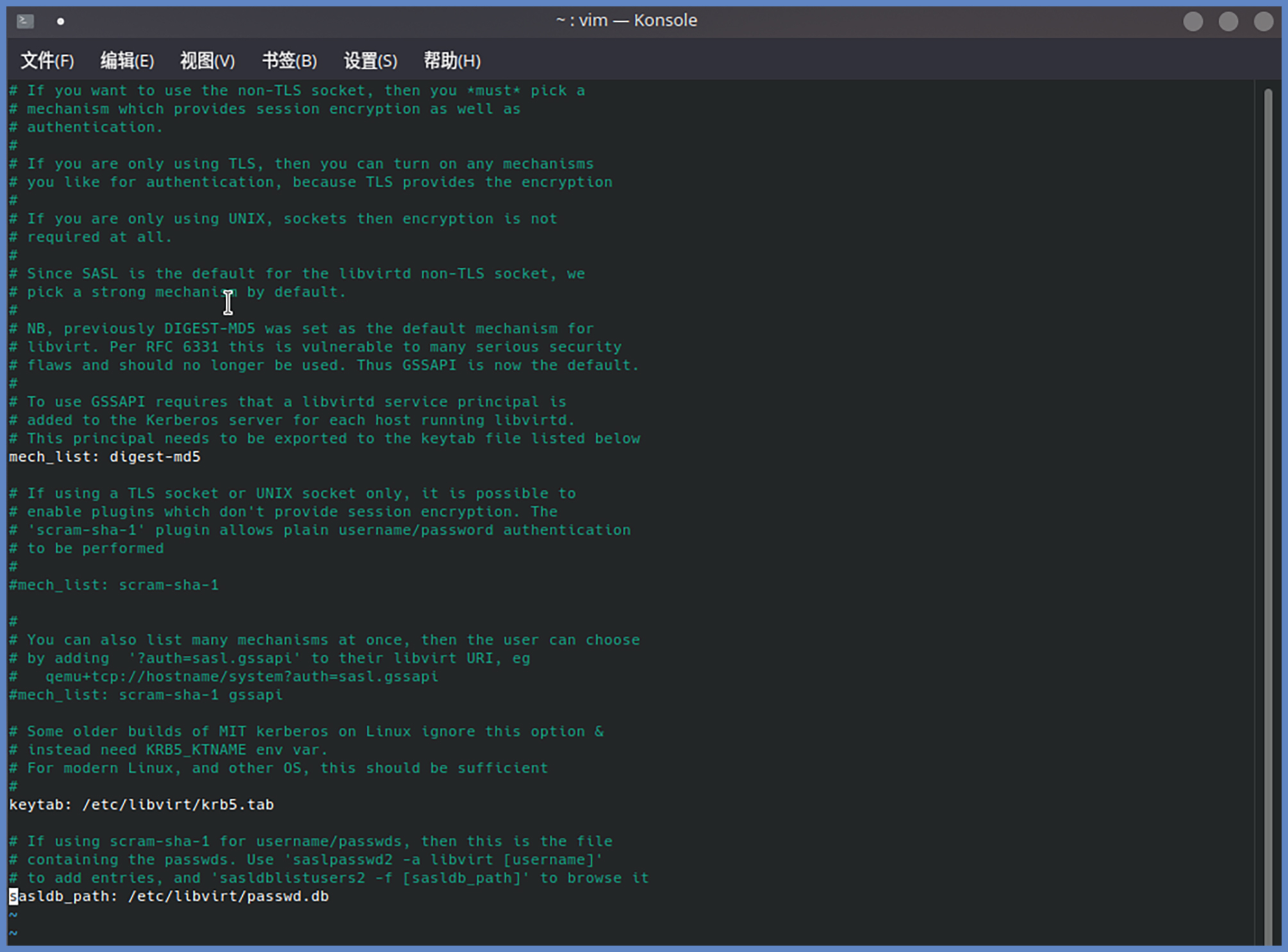 为了方便管理,我们需要创建管理员账号。在创建管理员账号之前,我们需要先确认一下/etc/sasl2/libvirt.conf文件的最后一行是不是sasldb_path: /etc/libvirt/passwd.db,以及mech_list的值是不是digest-md5。