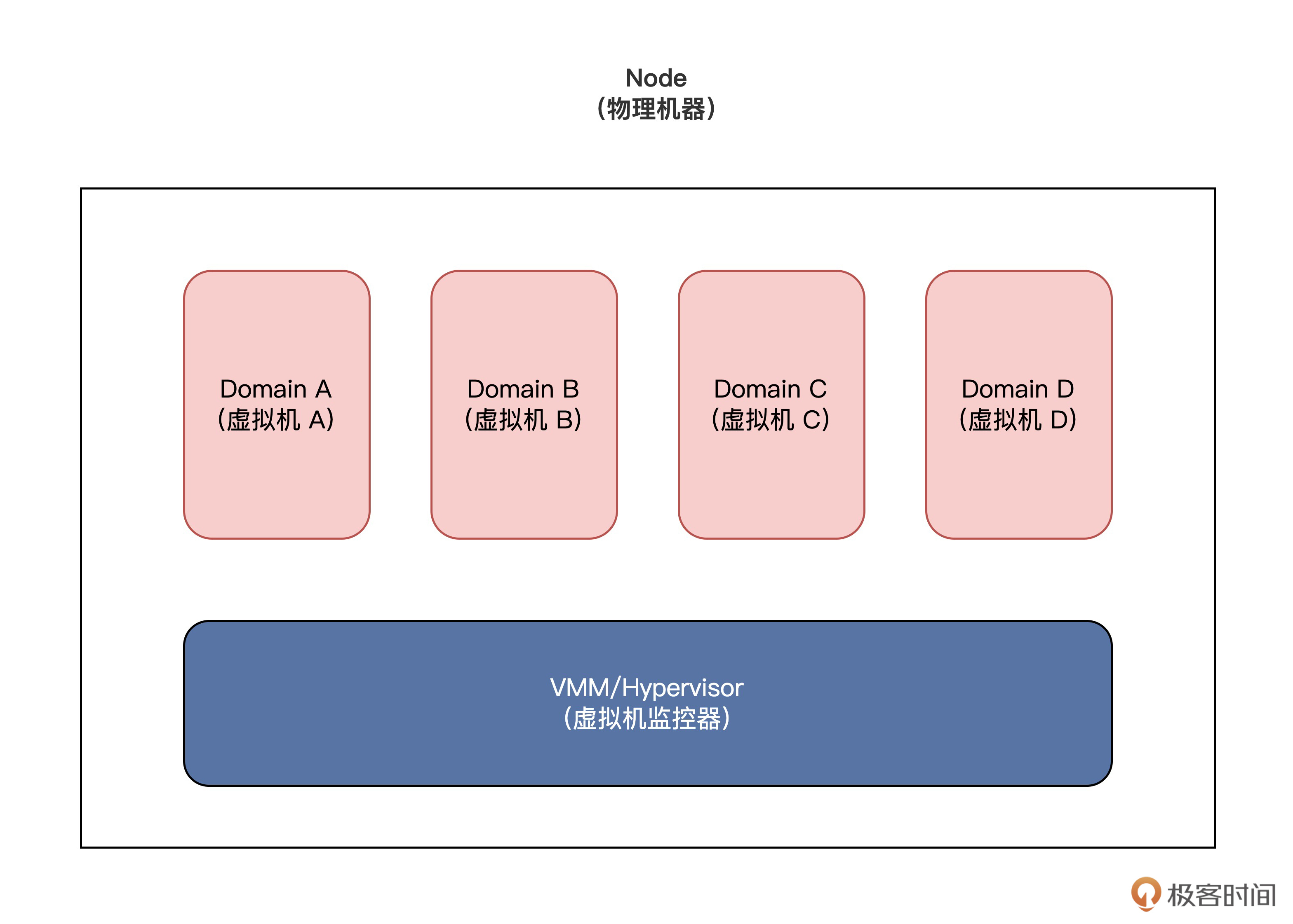 节点就是一台具体的物理机;虚拟机监控器是指用来管理物理机上多个虚拟机的软件;而域指的是具体运行在物理机上的一台虚拟机,有些云计算平台也把它称作客户机/实例,但其实表达的是同一个意思。