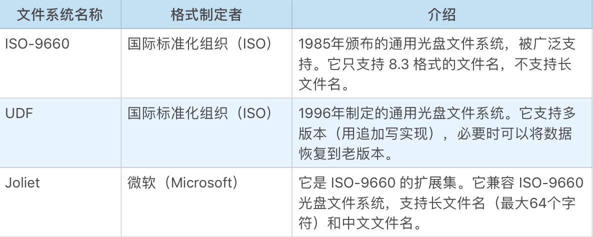 尽管几乎所有文件系统的接口是非常一致的,但文件系统的实现却有很多。对于随机只读型的外置存储(如光盘),常见的文件系统有如下这些。