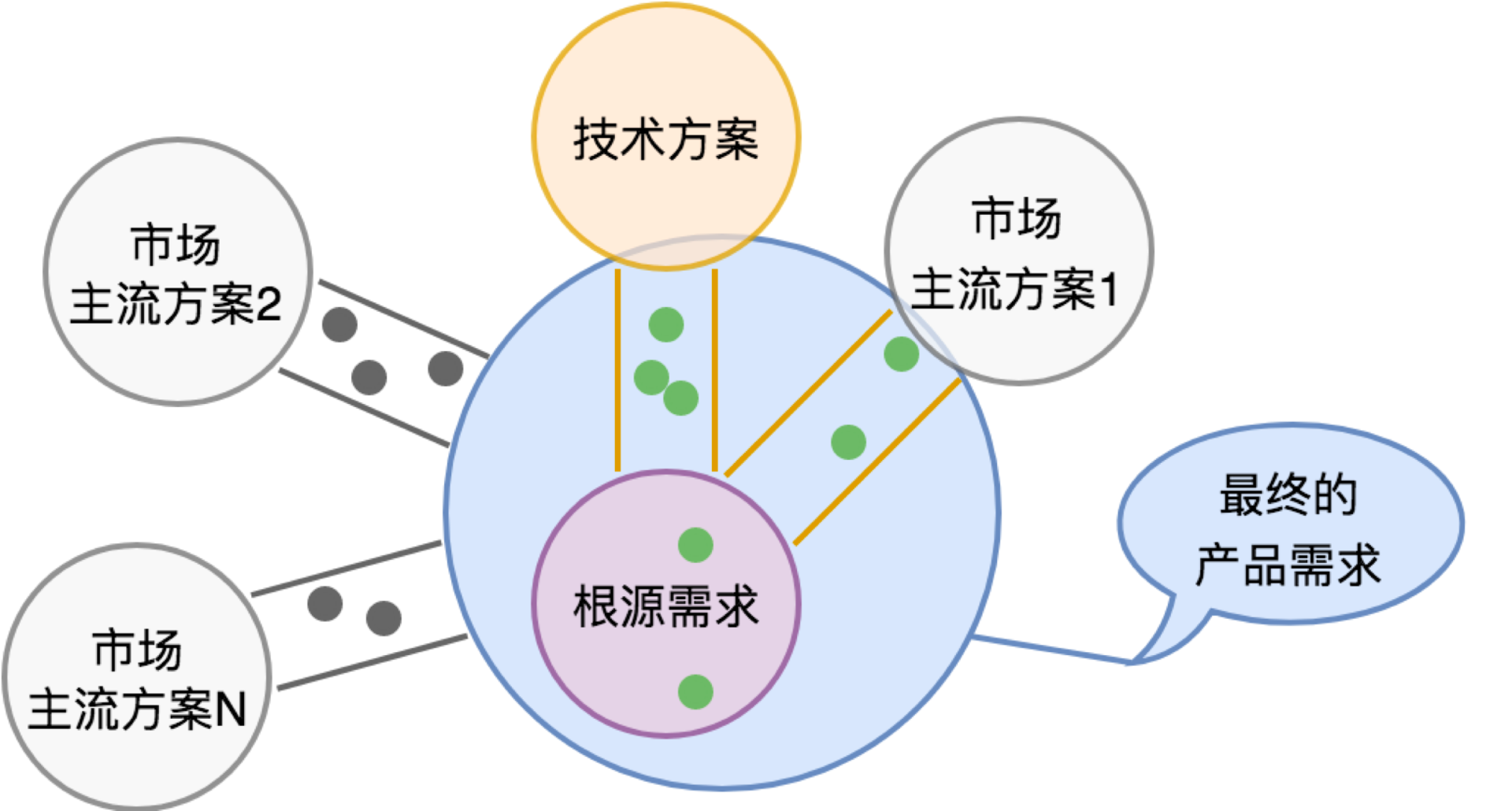 如上图所示,根源需求可能会有非常非常多的技术方案可以满足它。我们上面示意图中的小圆点是一个个用户反馈的需求。在用户提这些需求的时候,往往可能会带着他熟悉的技术方案的烙印。