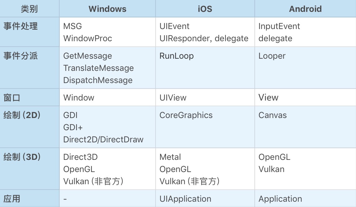 在操作系统的所有子系统中,交互相关的子系统是毫无疑问的差异性最大的子系统。我们这里列了一个简单的对比表格: