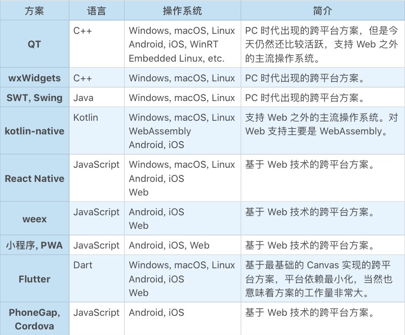 如此繁复多样的终端类型,无怪跨平台如此之难。我们来总结一下当前都有哪些跨平台的解决方案。