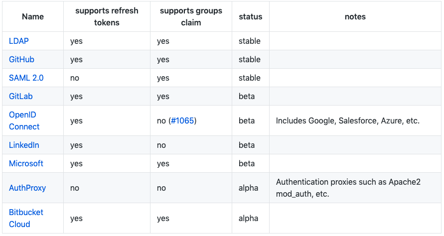 不同的 OpenID Provider 作为后端,会导致一些细节上的差异。有的 OpenID Provider 不支持更新令牌(Refresh Token),有的会导致 ID Token 不支持 groups 字段。详细在以上 Connector 列表中有明确说明。
