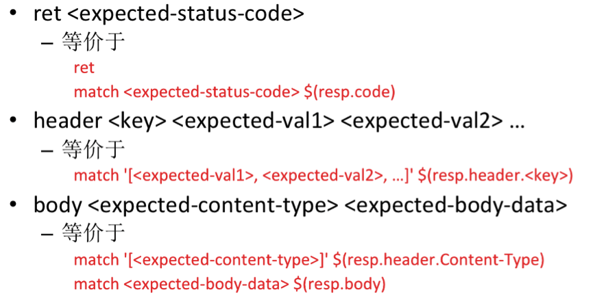 和其他自动化测试框架类似,这套 DSL 也提供了断言文法。它类似于 CppUnit 或 JUnit 之类的测试框架提供 assertEqual。具体如下: