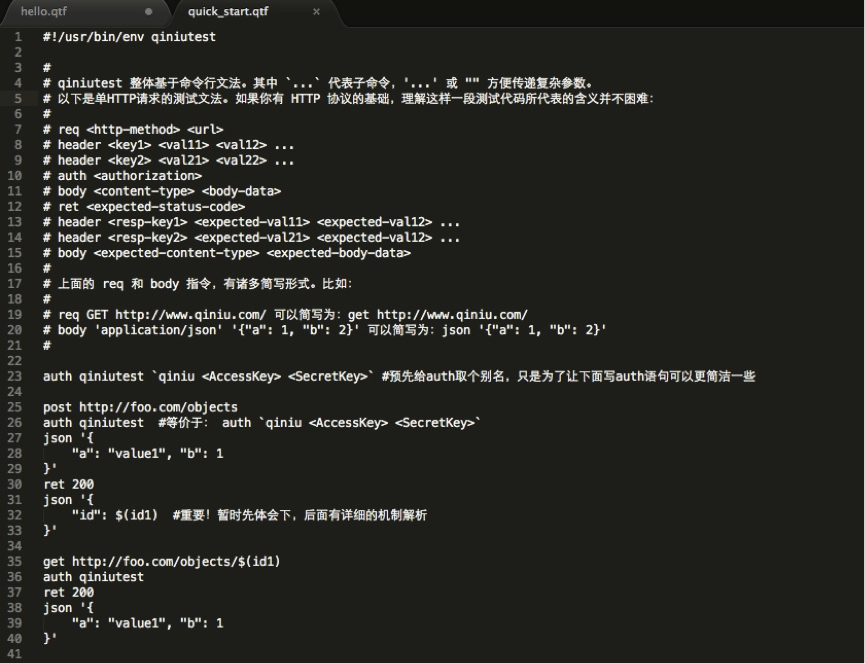 这段代码的第一句话是定义了一个 auth 别名叫 qiniutest,这只是为了让后面具体的 HTTP 请求中授权语句更简短。紧接着是发起一个 POST 请求,创建一个内容为 {“a”: “value1”, “b”: 1} 的对象,并将返回的对象 id 赋值给一个名为 id1 的变量。后面我们会详细解释这个赋值过程是如何进行的。