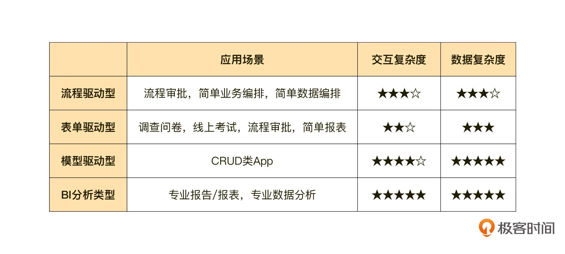 尽管我们这门课所说的低代码指的是“通用型”这一类,但这并不影响我们看看现在业界其他低代码平台都可以输出哪些类型的 App,大概有流程驱动型、表单驱动型、模型驱动(ORM)型、BI 分析类型这几种,具体你可以看看这张表格(5 星为满分):