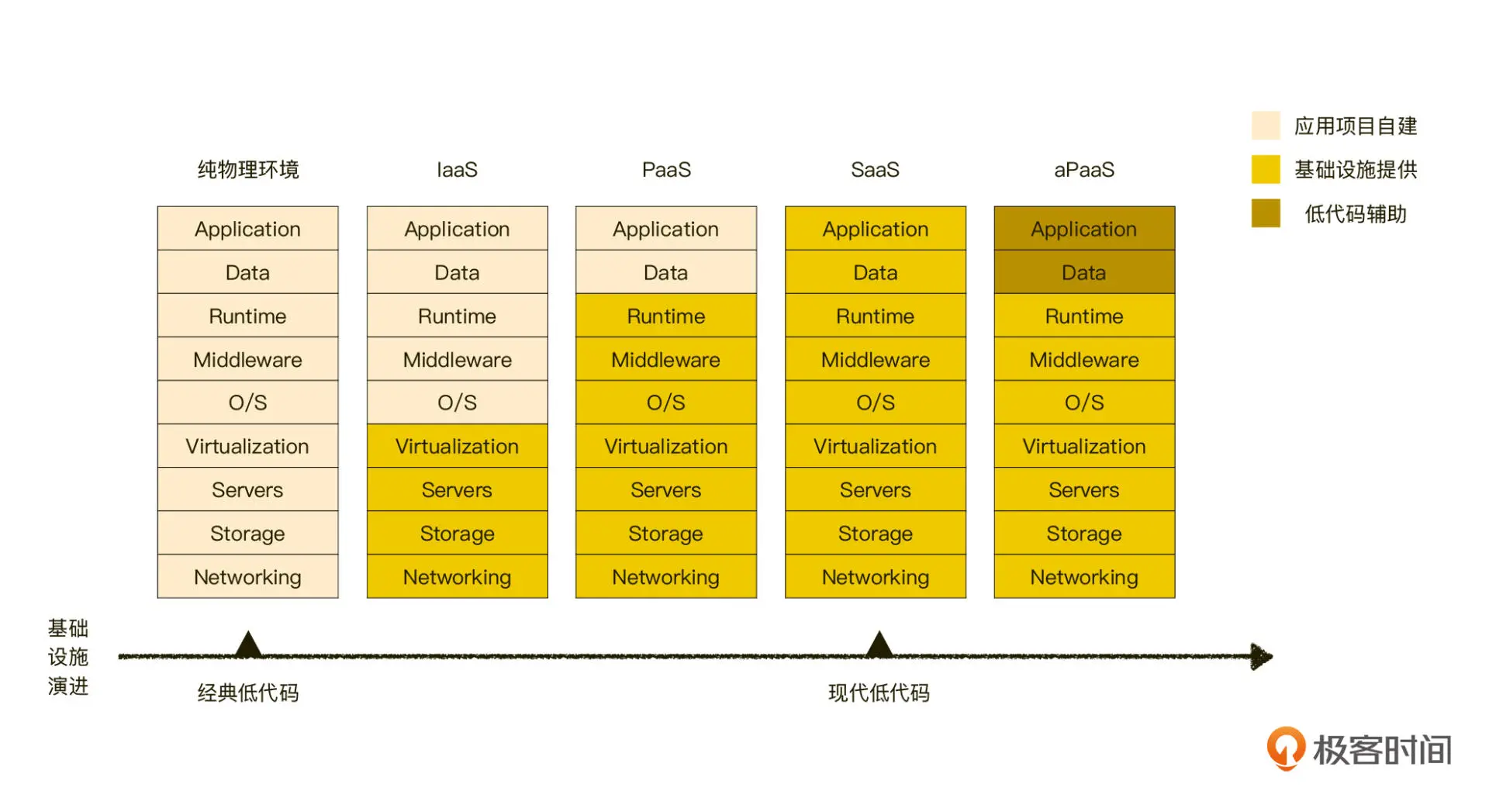 我们先从基础设施演进看低代码的发展,你可以先看看下面这张图:
