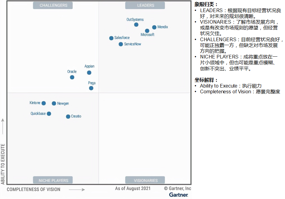 作为低代码的实现者,一般看这种报告都是以竞品调研为目的的,因此我们一般只研究 Leader 象限里的提供商就可以了。Leaders 这个象限显示的是技术能力较强、对未来的规划很清晰的厂商,其产品被市场广泛认可,对我们有极强的参考价值。