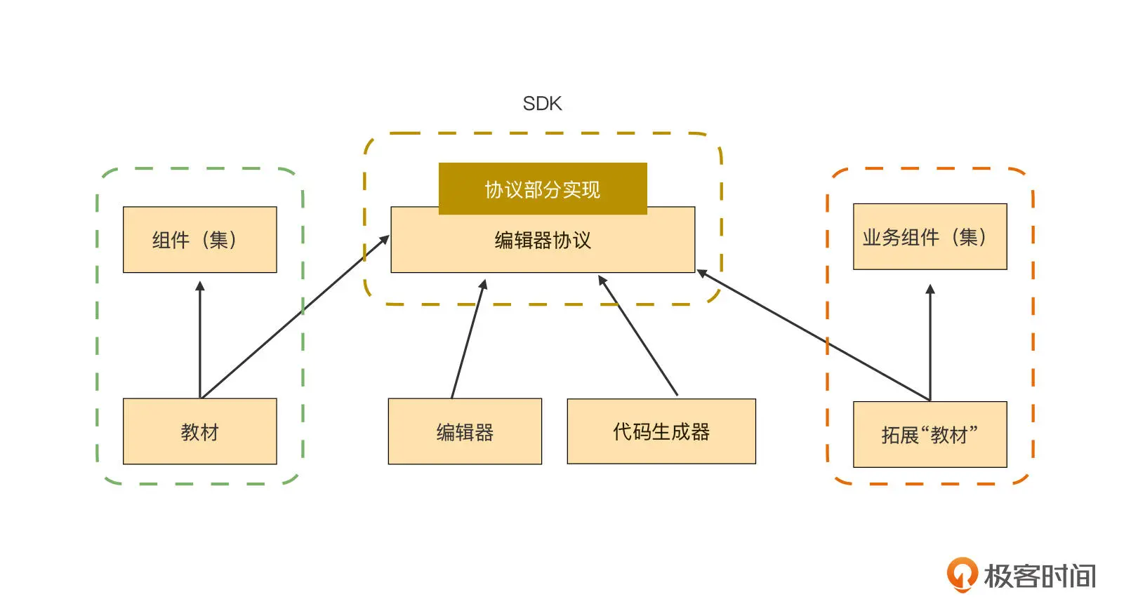 我们可以看到,“教材”、编辑器、代码生成器等模块都是低代码平台正常运行不可获取的重要部分,但图中它们三者之间却没有直接的耦合关系,相互隔离。这样的代码层次分明,职责明确,是一种非常好的关系结构: