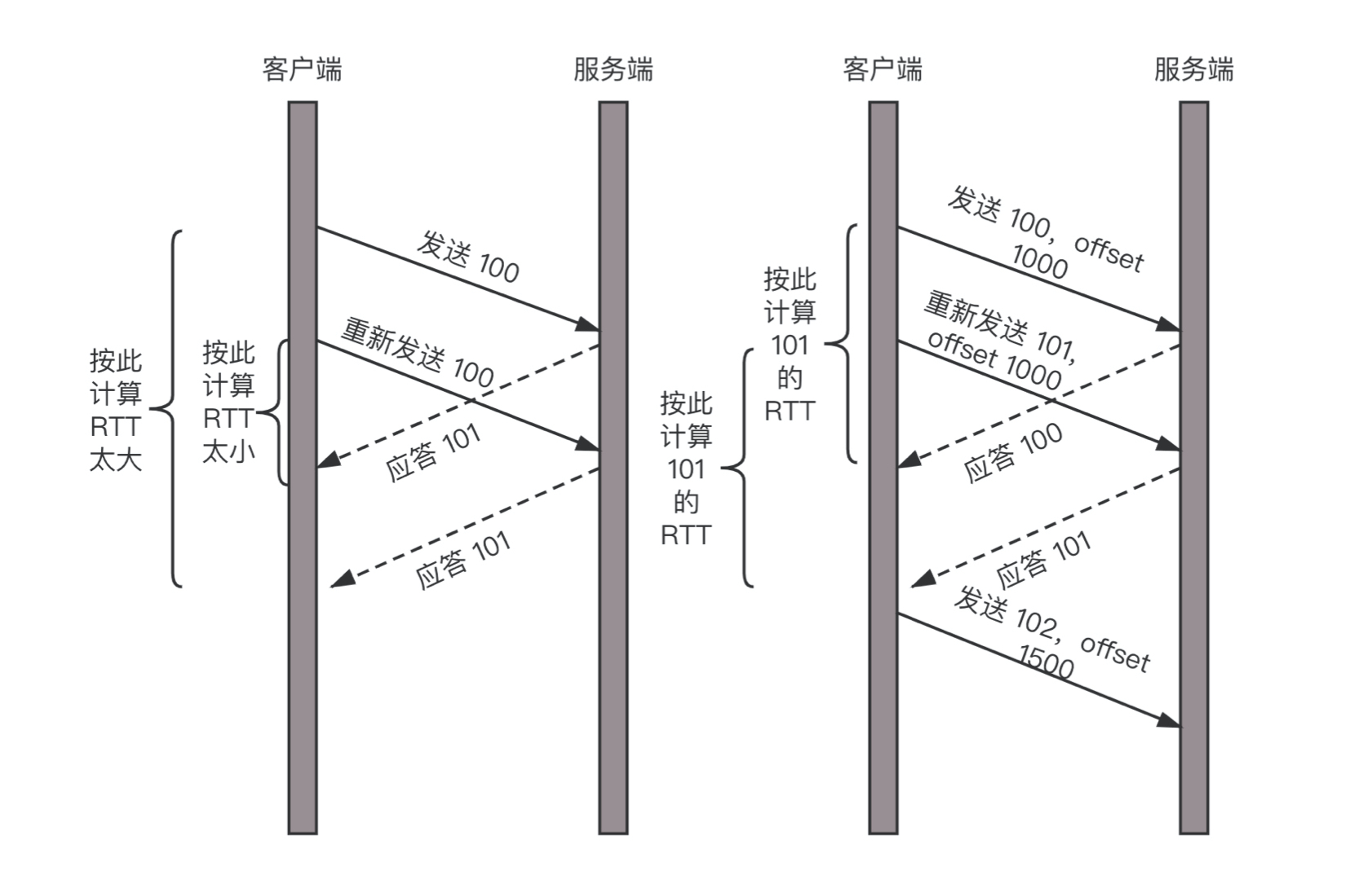 其实,在TCP里面超时的采样存在不准确的问题。例如,发送一个包,序号为100,发现没有返回,于是再发送一个100,过一阵返回一个ACK101。这个时候客户端知道这个包肯定收到了,但是往返时间是多少呢?是ACK到达的时间减去后一个100发送的时间,还是减去前一个100发送的时间呢?事实是,第一种算法把时间算短了,第二种算法把时间算长了。