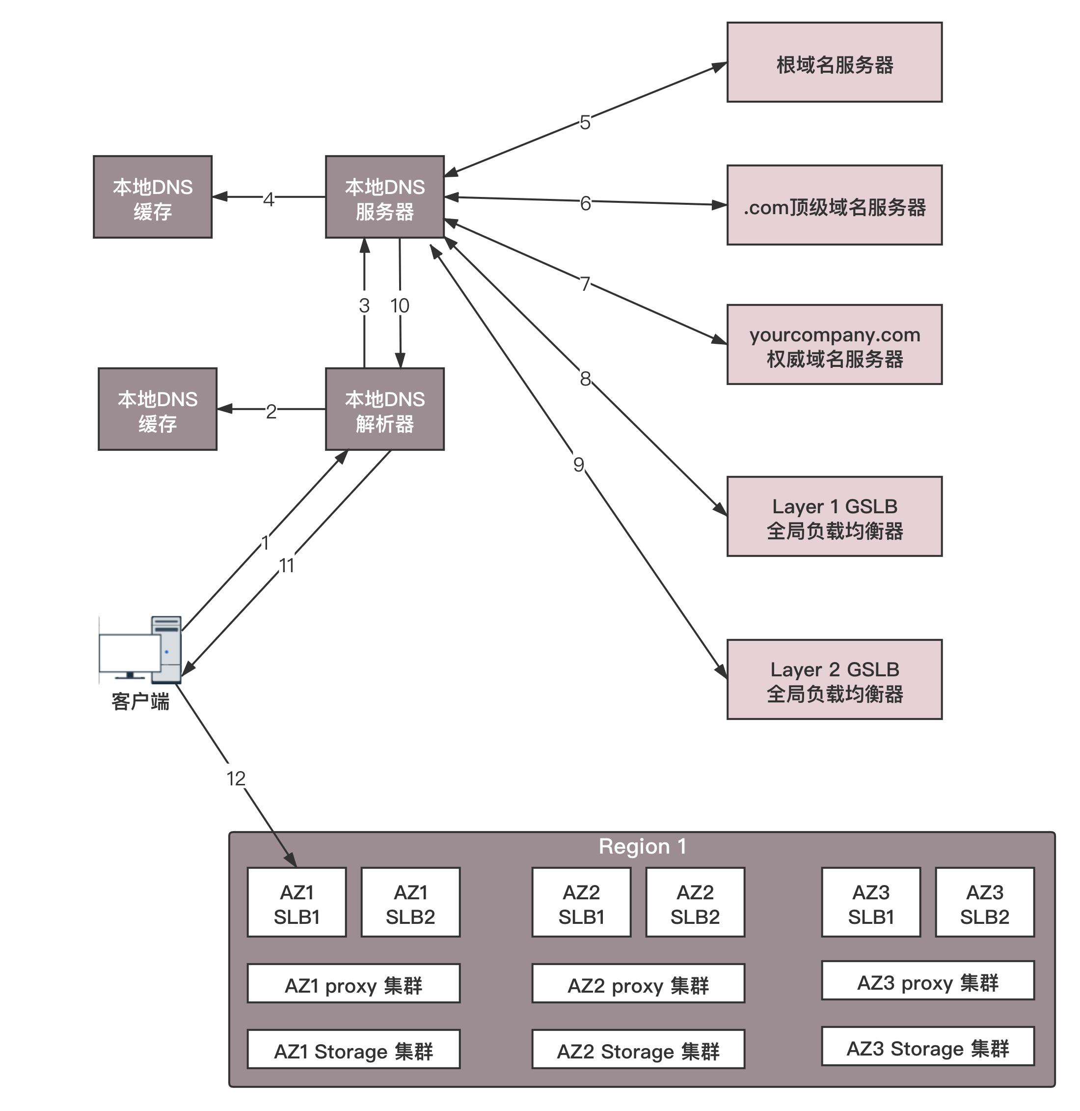当一个客户端要访问object.yourcompany.com的时候,需要将域名转换为IP地址进行访问,所以它要请求本地DNS解析器。