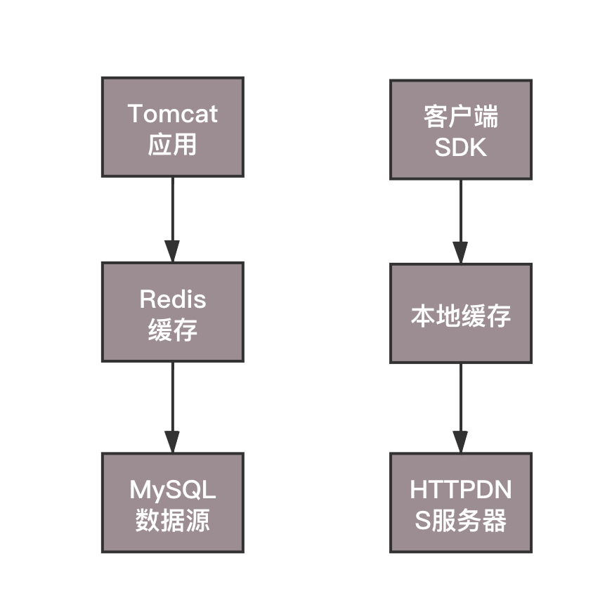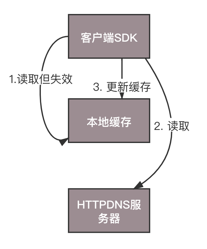 HttpDNS的缓存设计策略也是咱们做应用架构中常用的缓存设计模式,也即分为客户端、缓存、数据源三层。