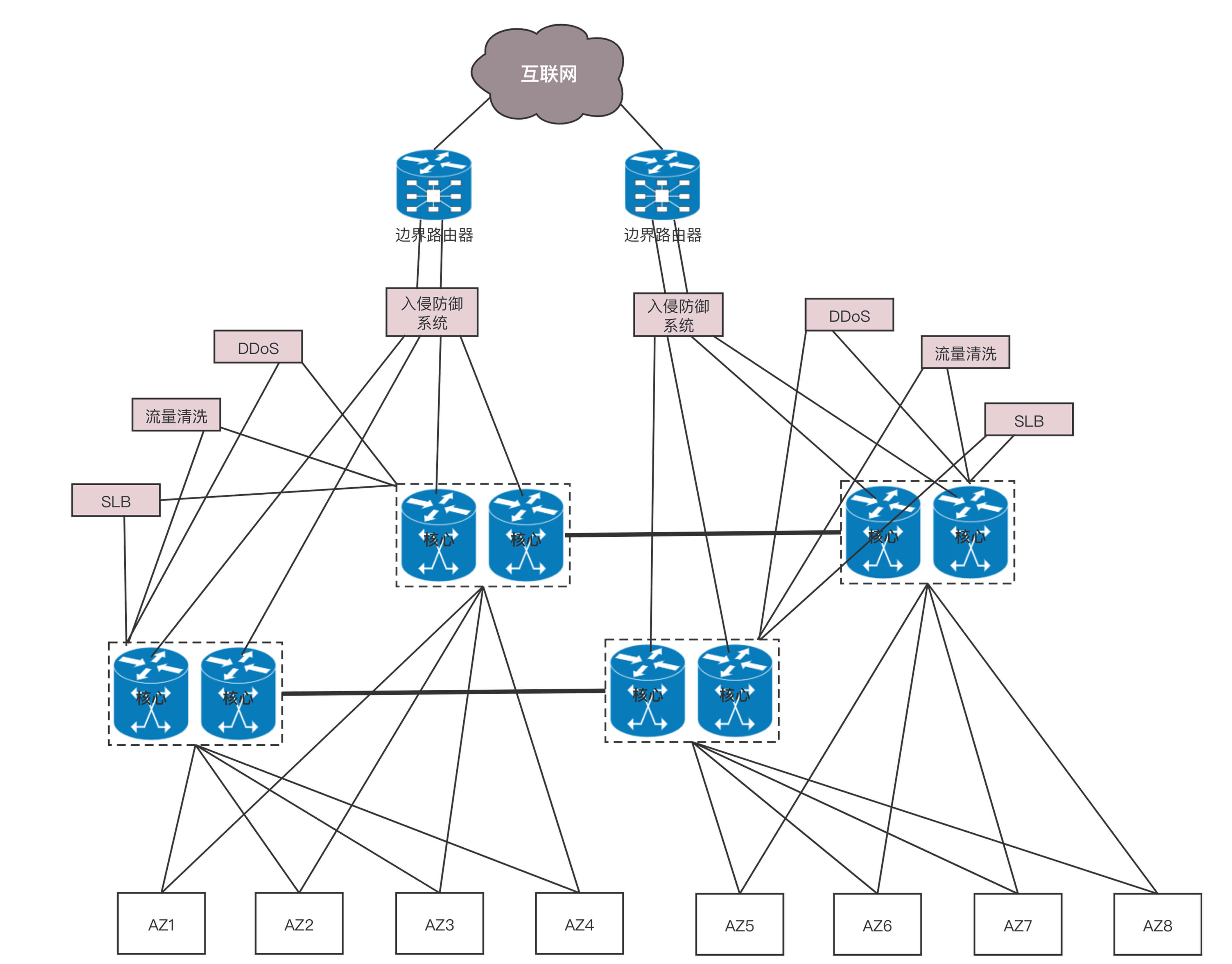 一般家里只会连接一个运营商的网络,而为了高可用,为了当一个运营商出问题的时候,还可以通过另外一个运营商来提供服务,所以数据中心的边界路由器会连接多个运营商网络。