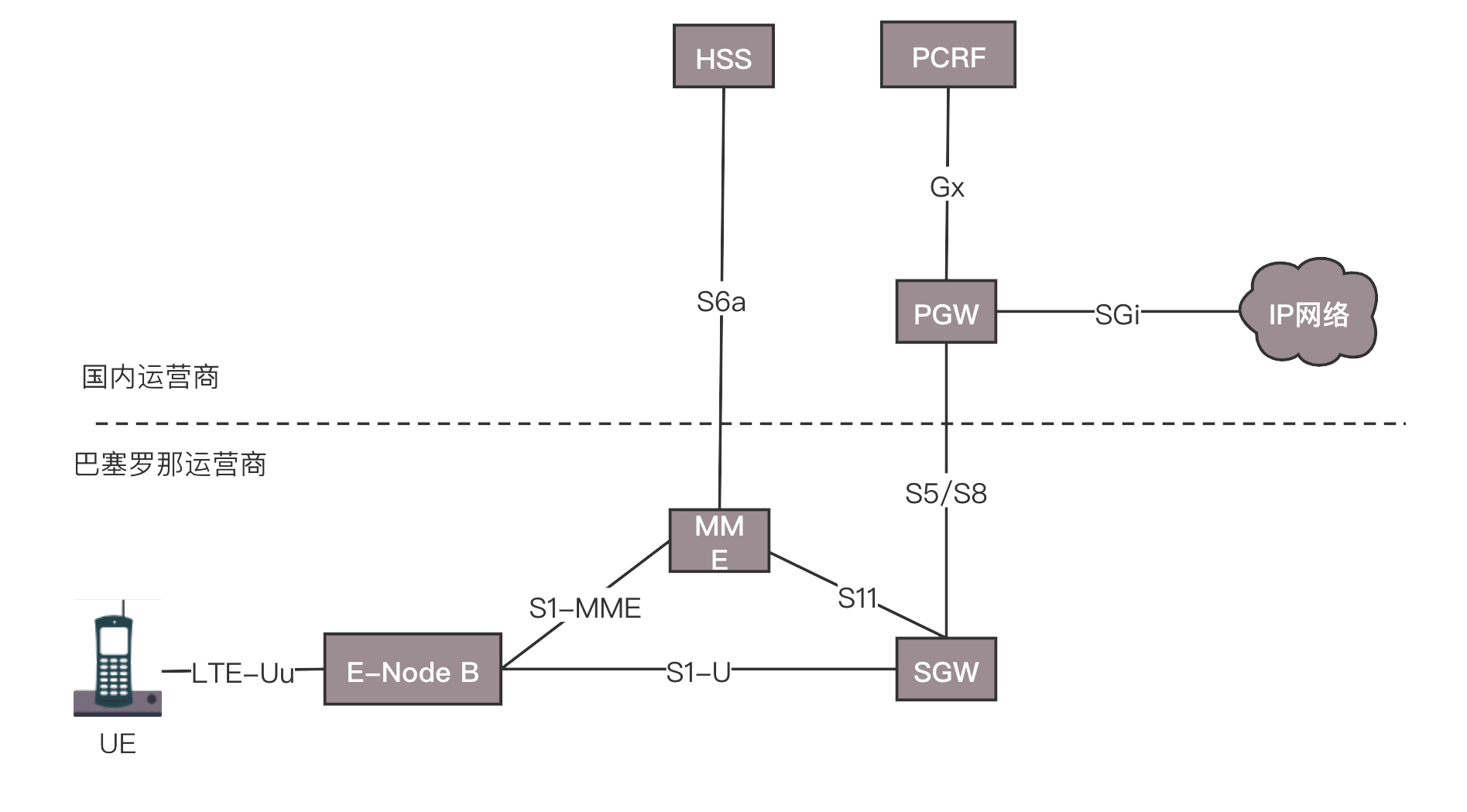 如果你在巴塞罗那,一下飞机,手机开机,周围搜寻到的肯定是巴塞罗那的eNodeB。通过MME去查询国内运营商的HSS,看你是否合法,是否还有钱。如果允许上网,你的手机和巴塞罗那的SGW会建立一个隧道,然后巴塞罗那的SGW和国内运营商的PGW建立一个隧道,然后通过国内运营商的PGW上网。
