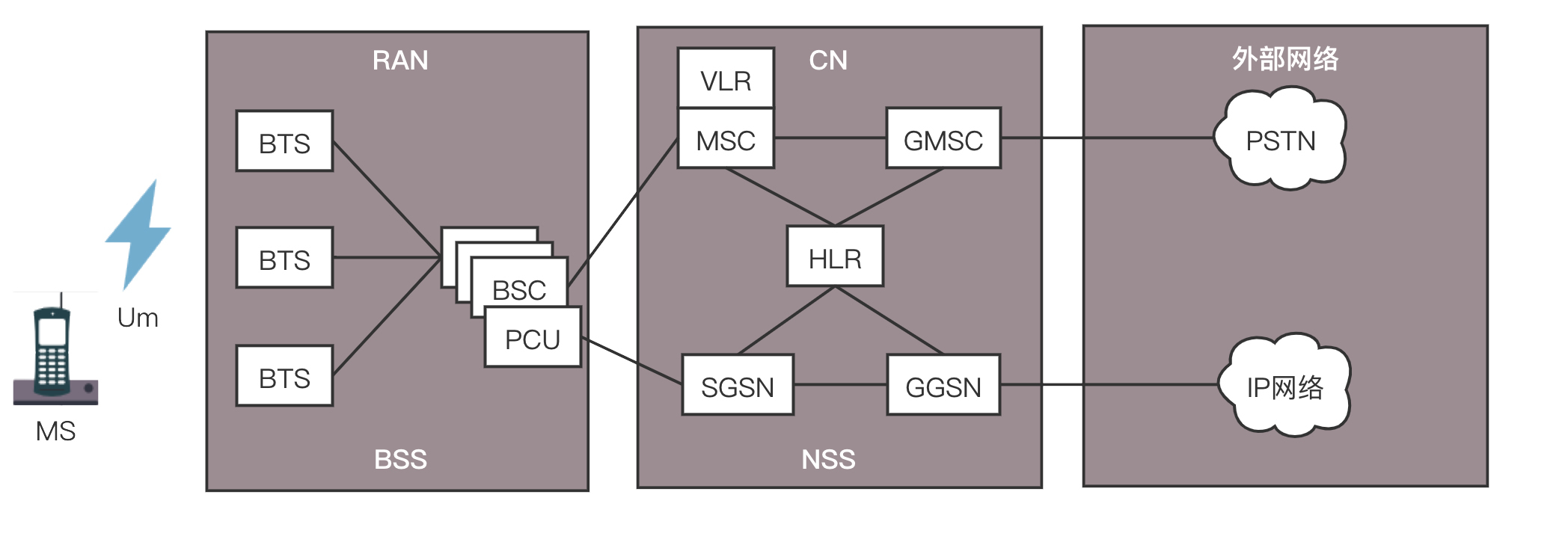 在上述网络的基础上,基站一面朝前接无线,一面朝后接核心网。在朝后的组件中,多了一个分组控制单元(PCU,Packet Control Unit),用以提供分组交换通道。