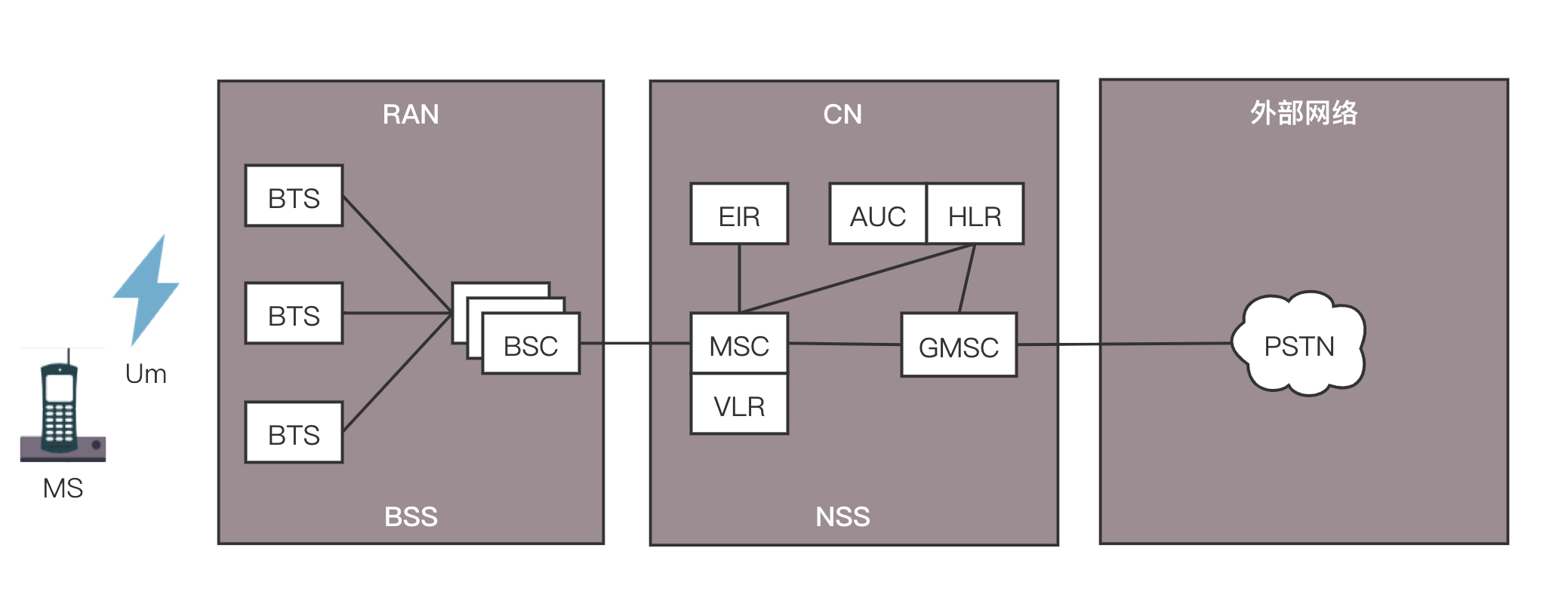 手机是通过收发无线信号来通信的,专业名称是Mobile Station,简称MS,需要嵌入SIM。手机是客户端,而无线信号的服务端,就是基站子系统(BSS,Base Station SubsystemBSS)。至于什么是基站,你可以回想一下,你在爬山的时候,是不是看到过信号塔?我们平时城市里面的基站比较隐蔽,不容易看到,所以只有在山里才会注意到。正是这个信号塔,通过无线信号,让你的手机可以进行通信。