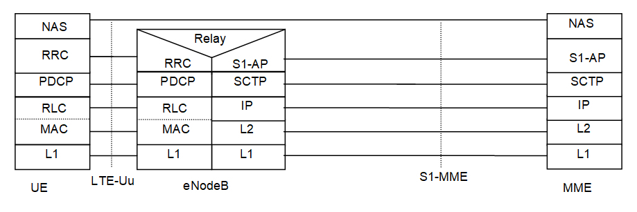其中虚线部分是控制面的协议。当一个手机想上网的时候,先要连接eNodeB,并通过S1-MME接口,请求MME对这个手机进行认证和鉴权。S1-MME协议栈如下图所示。