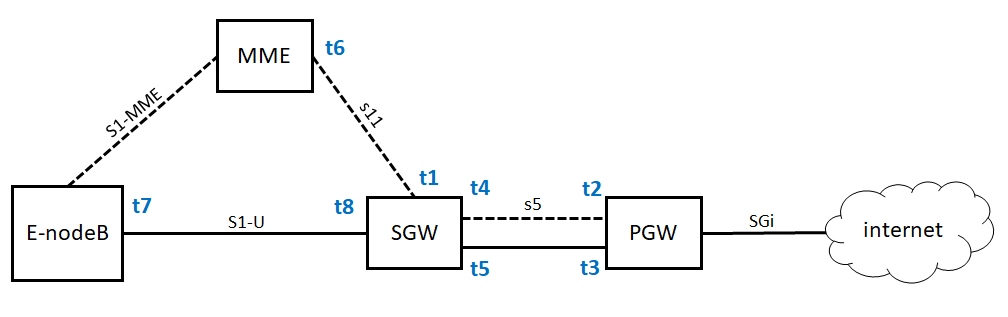 建设的数据通路分两段路,其实是两个隧道。一段是从eNodeB到SGW,这个数据通路由MME通过S1-MME协议告诉eNodeB,它是隧道的一端,通过S11告诉SGW,它是隧道的另一端。第二端是从SGW到PGW,SGW通过S11协议知道自己是其中一端,并主动通过S5协议,告诉PGW它是隧道的另一端。