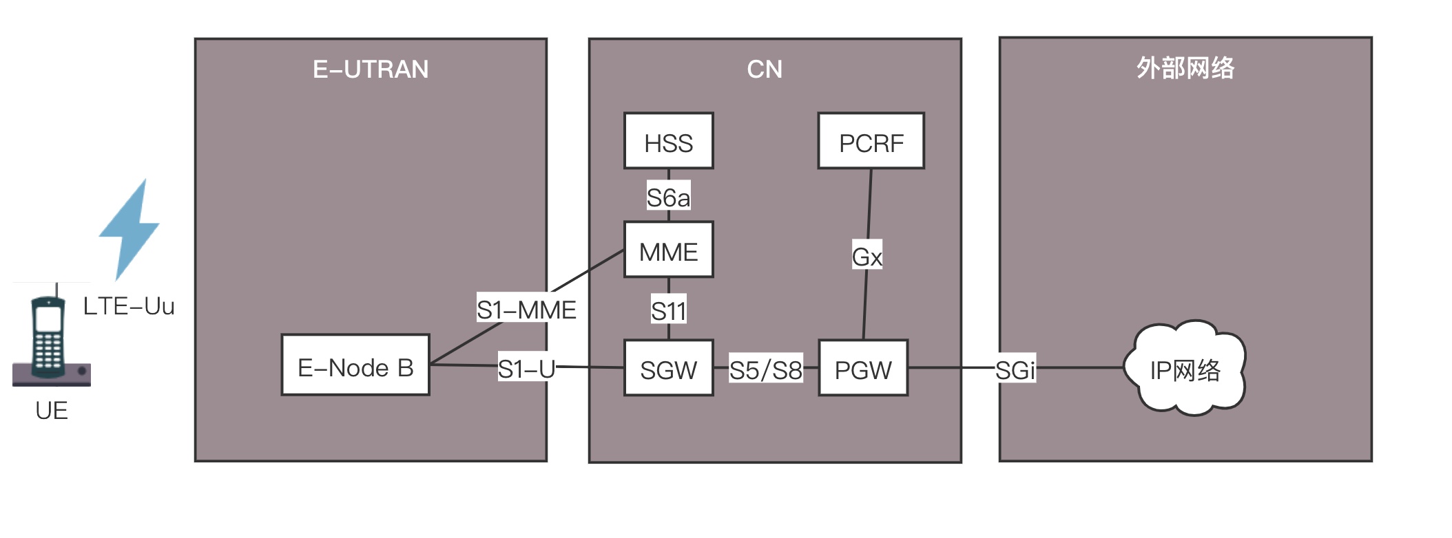 我们来仔细看一下4G网络的协议,真的非常复杂。我们将几个关键组件放大来看。