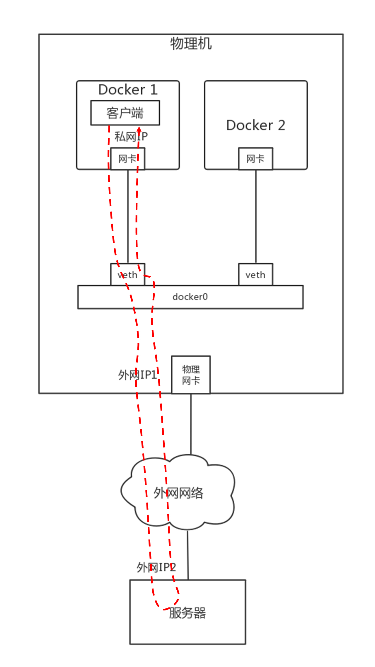 从容器内部的客户端访问外部网络中的服务器,我画了一张图。在[虚拟机]那一节,也有一张类似的图。