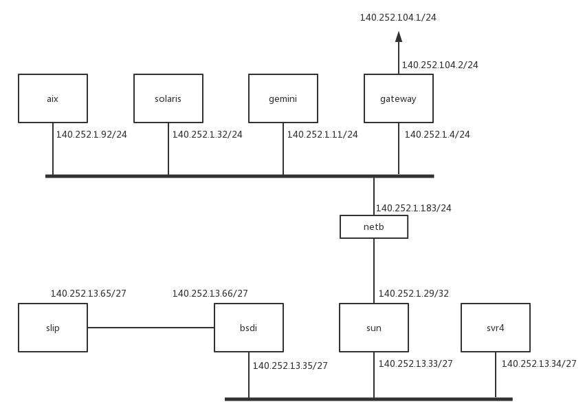对于bsdi和svr4来讲,如果去外网,sun下面的网口13.33是网关。