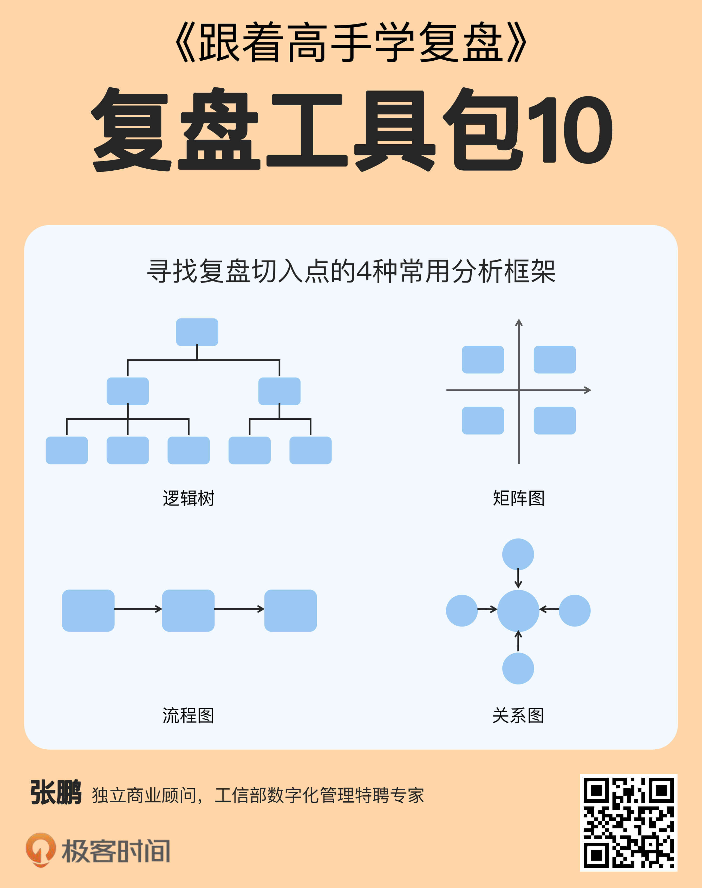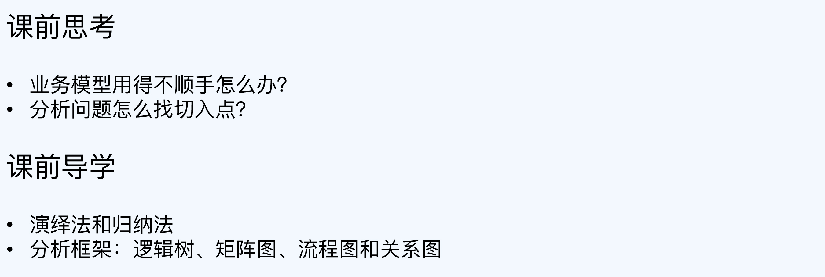 第1种分析框架是逻辑树,基于MECE原则把主题逐层分解(第6讲详细介绍过)。