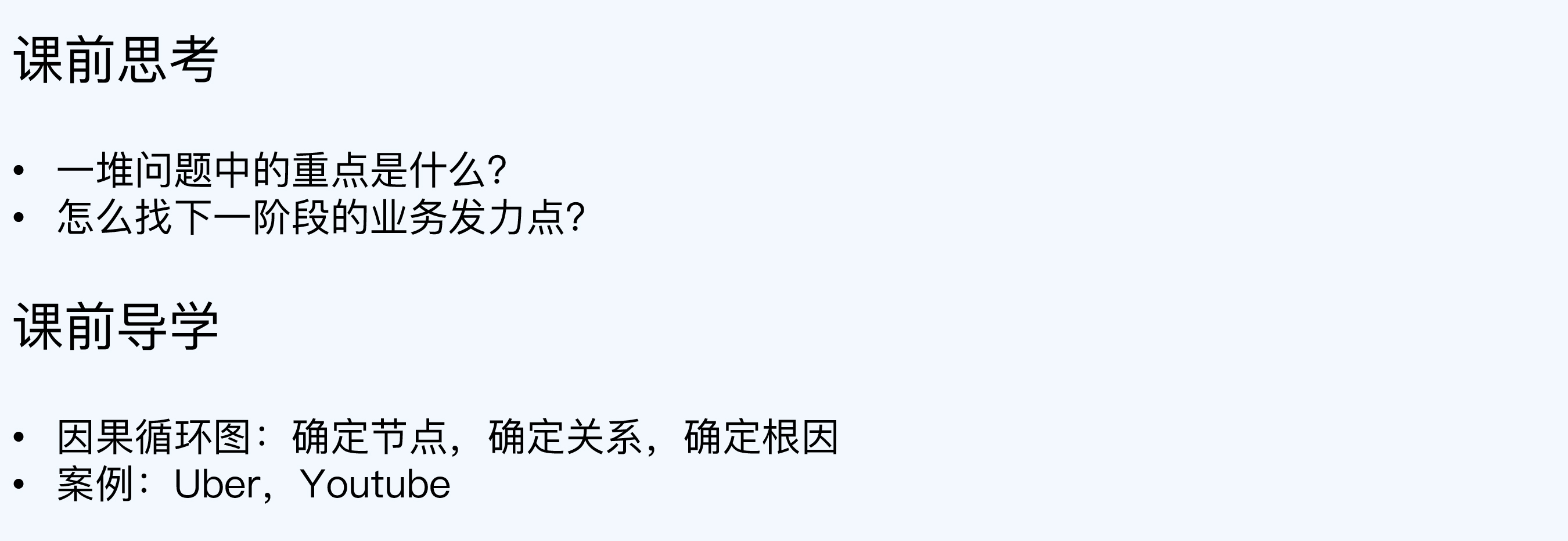 这一讲,我用Uber的案例为你讲解了使用因果循环图的技巧,并且通过Youtube的案例来帮助你加强理解。现在,我们来回顾一下重点内容: