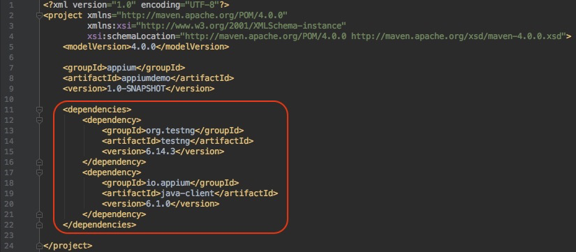 第19行的java-client是关键,java-client的作用是利用Java代码将测试用例中的操作步骤发送给Appium Server,然后由Appium Server自动完成这些操作。