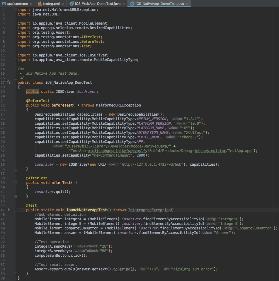 对于测试用例的主体部分,也就是代码的第45-47行就比较简单了,首先打开Safari浏览器并访问“http://appium.io/”,接着用断言方法assertEquals验证页面的Title是不是“Appium: Mobile App Automation Made Awesome.”。其中,实际页面的Title,可以通过mobiledriver的getTitle方法获得。