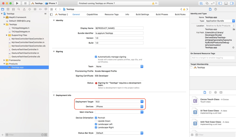 在Xcode的“General”页面,将TestApp的“Deployment Target”设置为10.0,并且将“Devices”设置为“iPhone”,如图2所示。