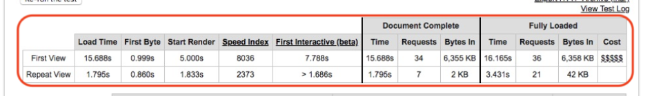 现在,我们再回过头来看看如图8所示的表格,这个表格包含了很多的前端性能指标,大多数指标,我们可以从字面上很容易理解其含义,比如Load Time、First Byte、Requests等,我就不再赘述了。