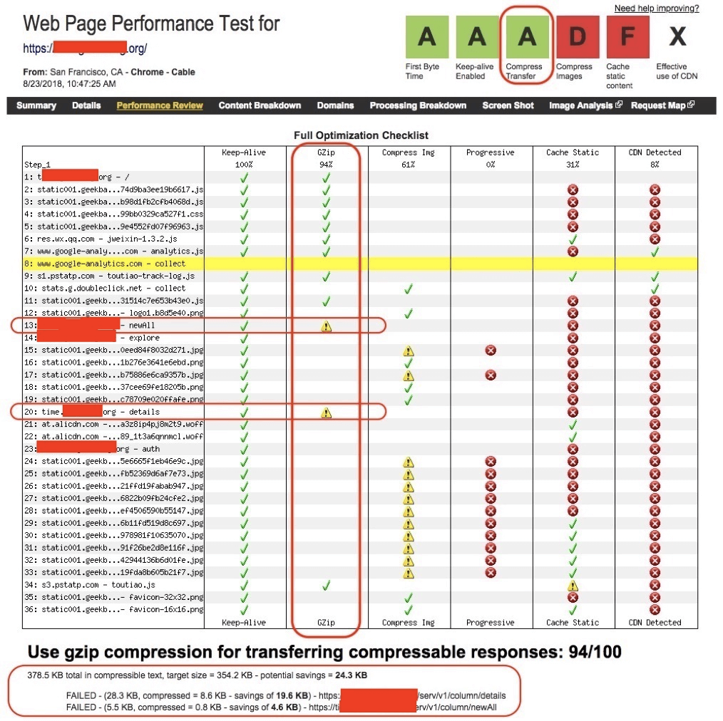 如图4所示,本次测试结果显示,这个网站绝大多数的文本类资源都通过GZip进行了压缩,所以WebPagetest也给出了A级的评分。但是第13和第20项的两个资源并没有被压缩,报告中显示如果这两个资源也经过压缩,将可以减少额外的24.3KB的数据传输量。