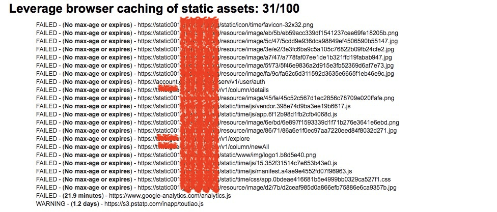 如图6所示,本次测试结果显示,被测网站有超过一半的静态资源没有被浏览器缓存,每次都需要从Web服务器端获取,所以WebPagetest给出了F级的评分。