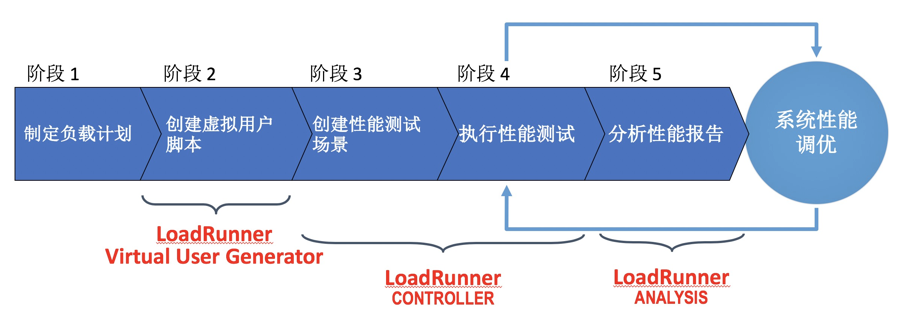 从宏观角度来讲,基于LoadRunner完成企业级性能测试,可以划分为五个阶段: