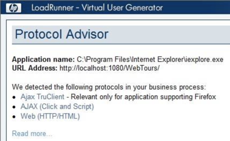 接下来,你就可以使用Protocol Advisor建议的录制协议开始脚本录制工作了。如图1所示就是Protocol Advisor给出的建议录制协议界面。