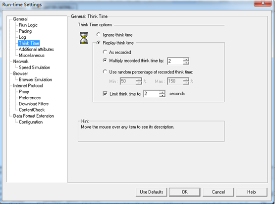 你在后续调整思考时间时,无需逐行修改虚拟用户脚本代码,可以在Run-time Settings(运行时设置)中很方便地完成。如图3所示,Run-time Settings中支持多种方式调整思考时间。