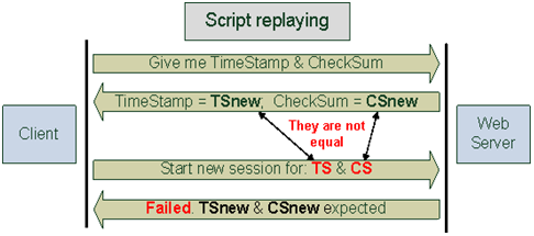 采用Time Stamp + CheckSum的组合作为Session ID的方式,在我们回放这个脚本的时候就有问题了。因为回放时,这段硬编码已经有了新的Time Stamp值和CheckSum值,并且显然与之前的值不同,所以服务器无法完成Session ID的验证,也就导致了脚本回放失败。