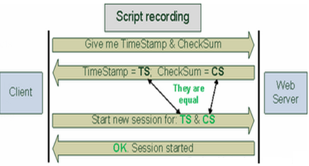 假设,每次客户端连接服务器端时,服务器端都会用当前的时间戳(Time Stamp)计算CheckSum,然后将Time Stamp和CheckSum返回给客户端。然后,客户端就把Time Stamp + CheckSum的组合作为唯一标识客户端的Session ID。录制脚本时,录制得到的一定是硬编码(hardcode)的Time Stamp值和CheckSum值。