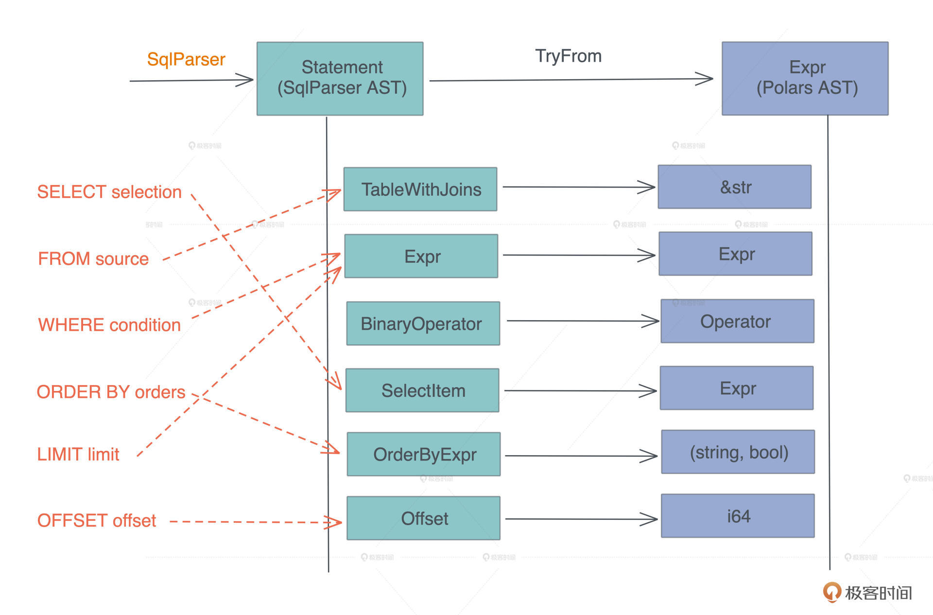 确定了这两个库之后,后续的工作就是:如何把 sqlparser 解析出来的抽象语法树 AST(Abstract Syntax Tree),映射到 polars 的 DataFrame 的操作上。