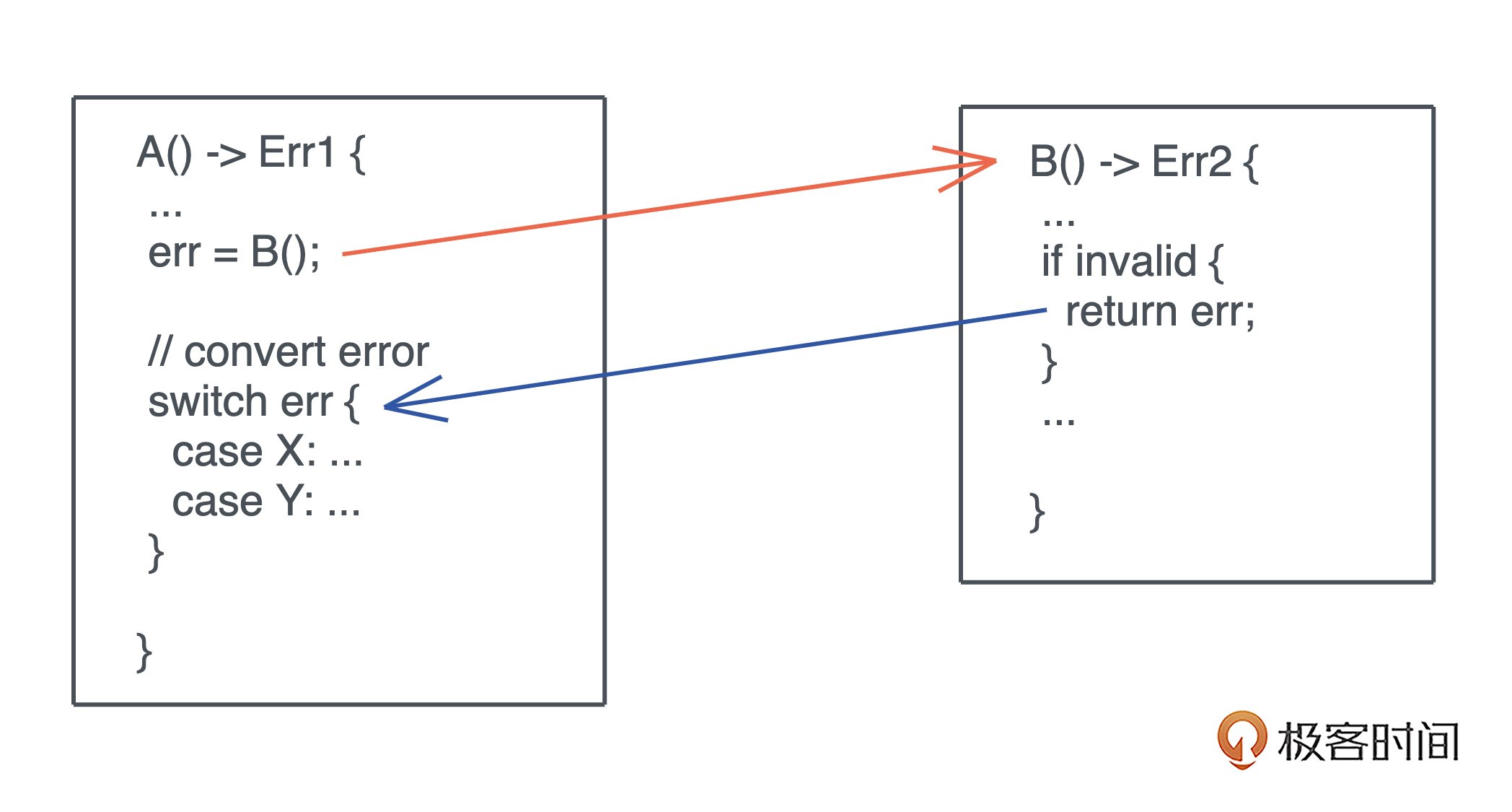 如果函数 A 调用了函数 B,在 A 返回错误的时候,就要把 B 的错误转换成 A 的错误,显示出来。如下图所示:-