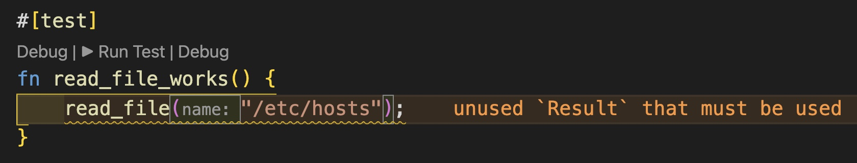 这里,如果我们调用 read_file 函数时,直接丢弃返回值,由于 #[must_use] 的标注,Rust 编译器报警,要求我们使用其返回值。