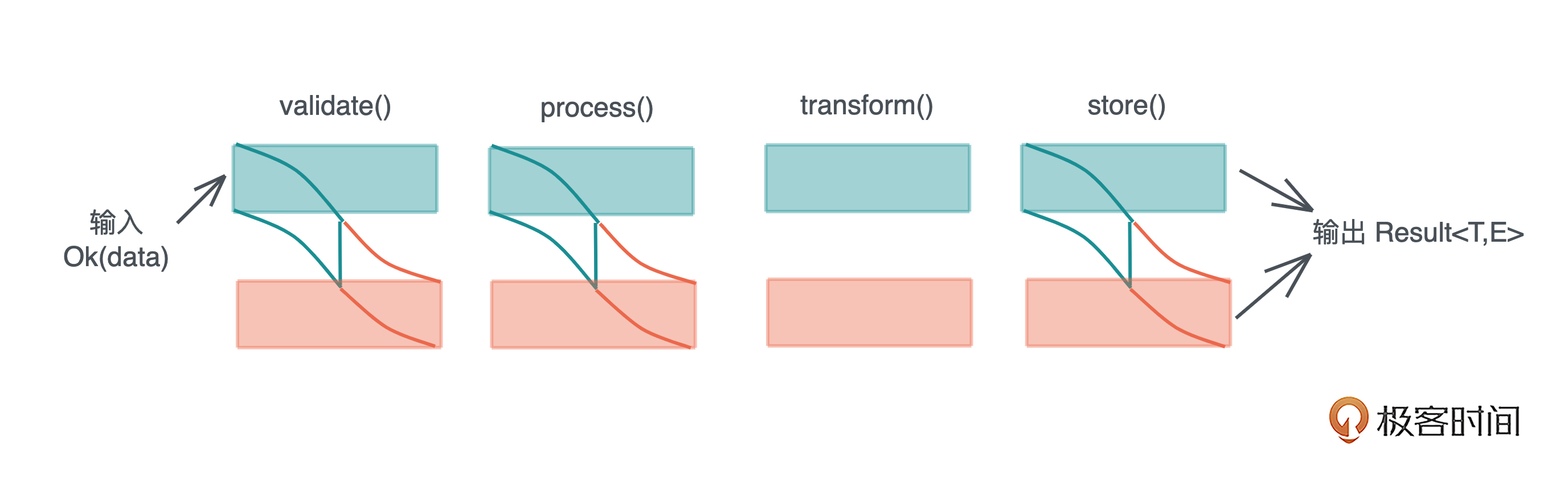 通过这些函数,你可以很方便地对错误处理引入 Railroad oriented programming 范式。比如用户注册的流程,你需要校验用户输入,对数据进行处理,转换,然后存入数据库中。你可以这么撰写这个流程: