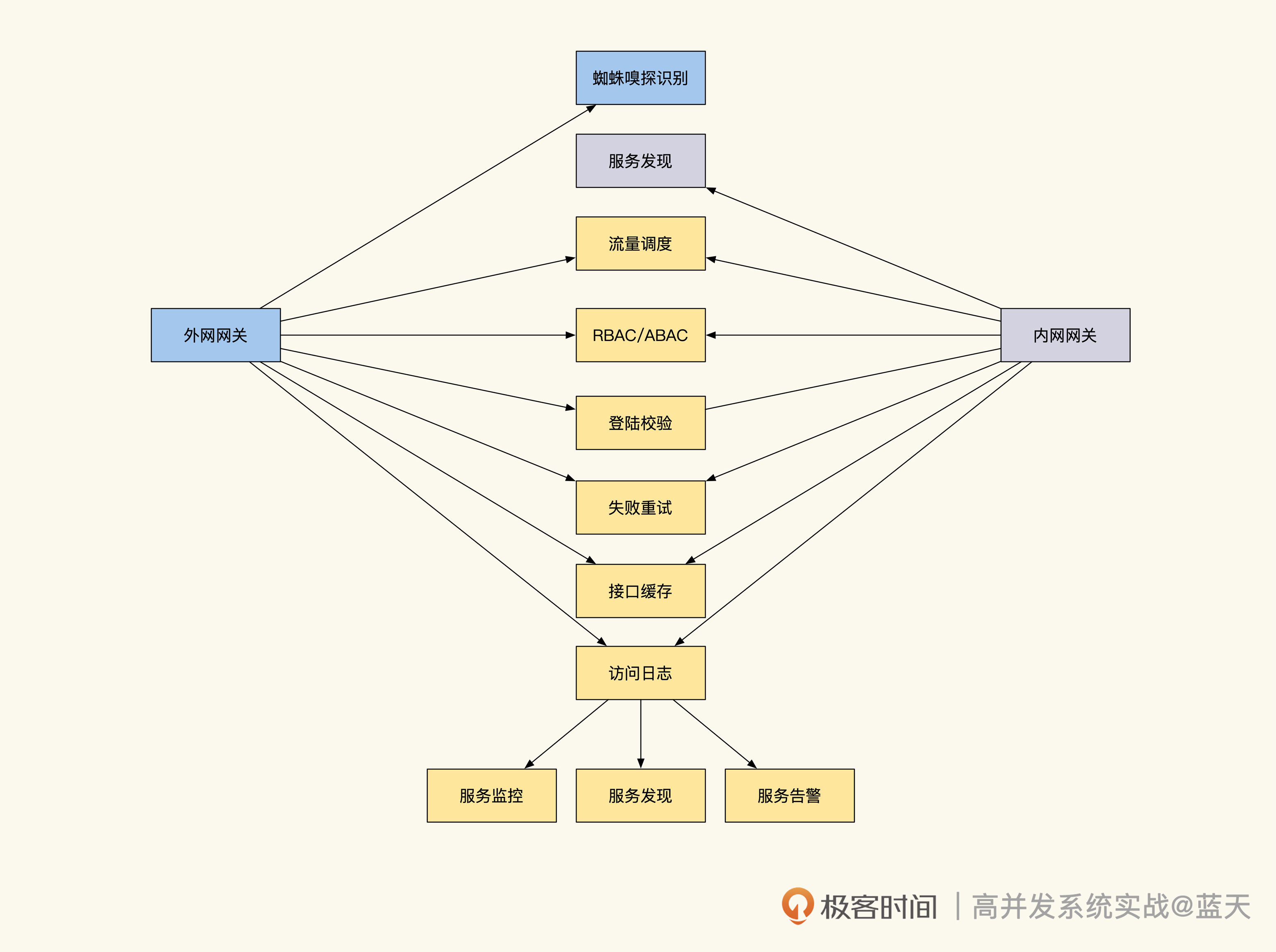 这节课我给你分享了网关的很多巧妙用法,包括利用网关预防入侵、解除业务依赖、辅助系统平滑升级、提升用户体验、缓解流量冲击以及实现粒度稍大一些的服务监控。