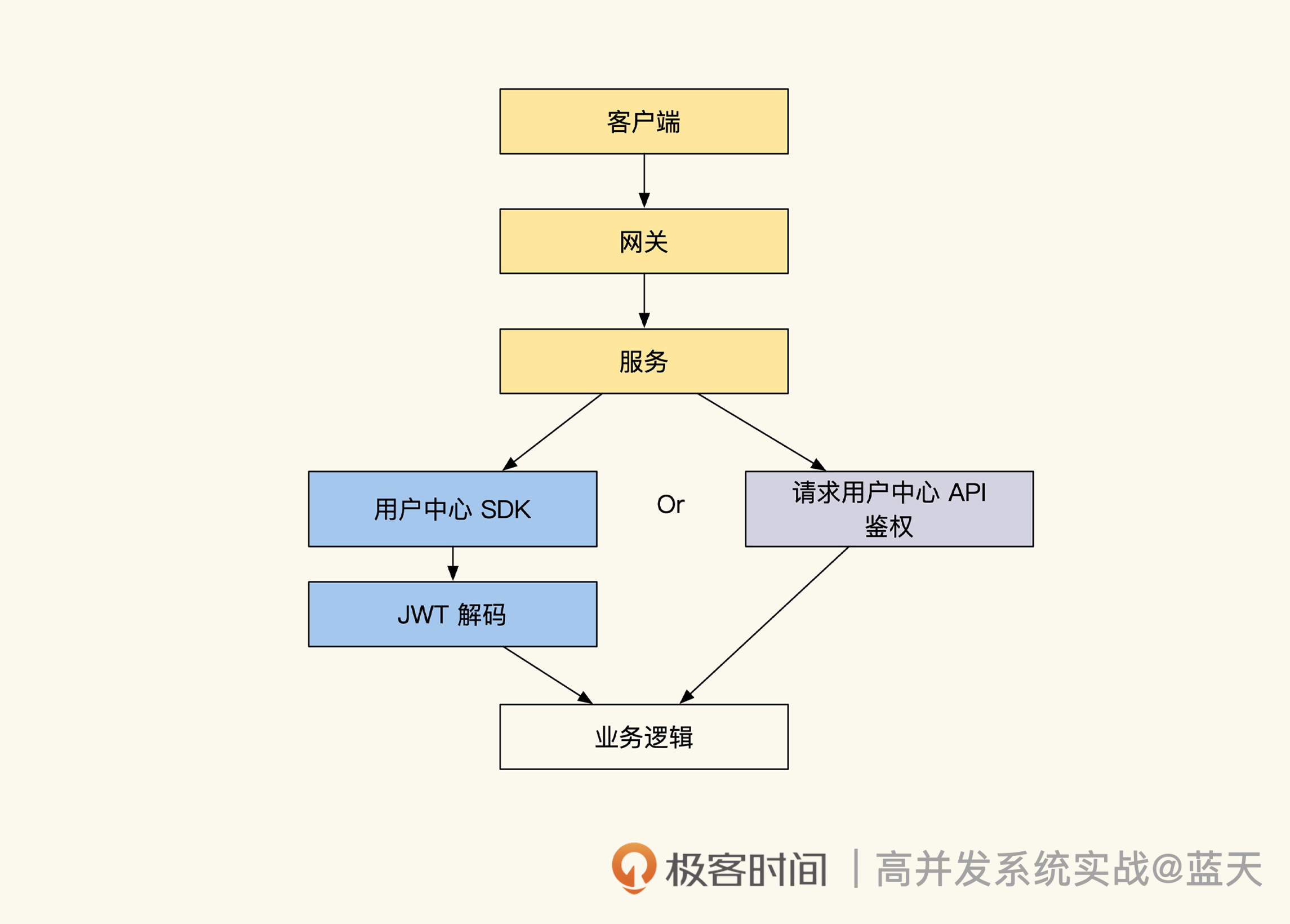 还记得我们第三节课提到的用户登陆设计么?每个业务可以不依赖用户中心来验证用户合法性,用户鉴权普遍会通过每个子业务集成用户中心的SDK来实现校验逻辑统一。