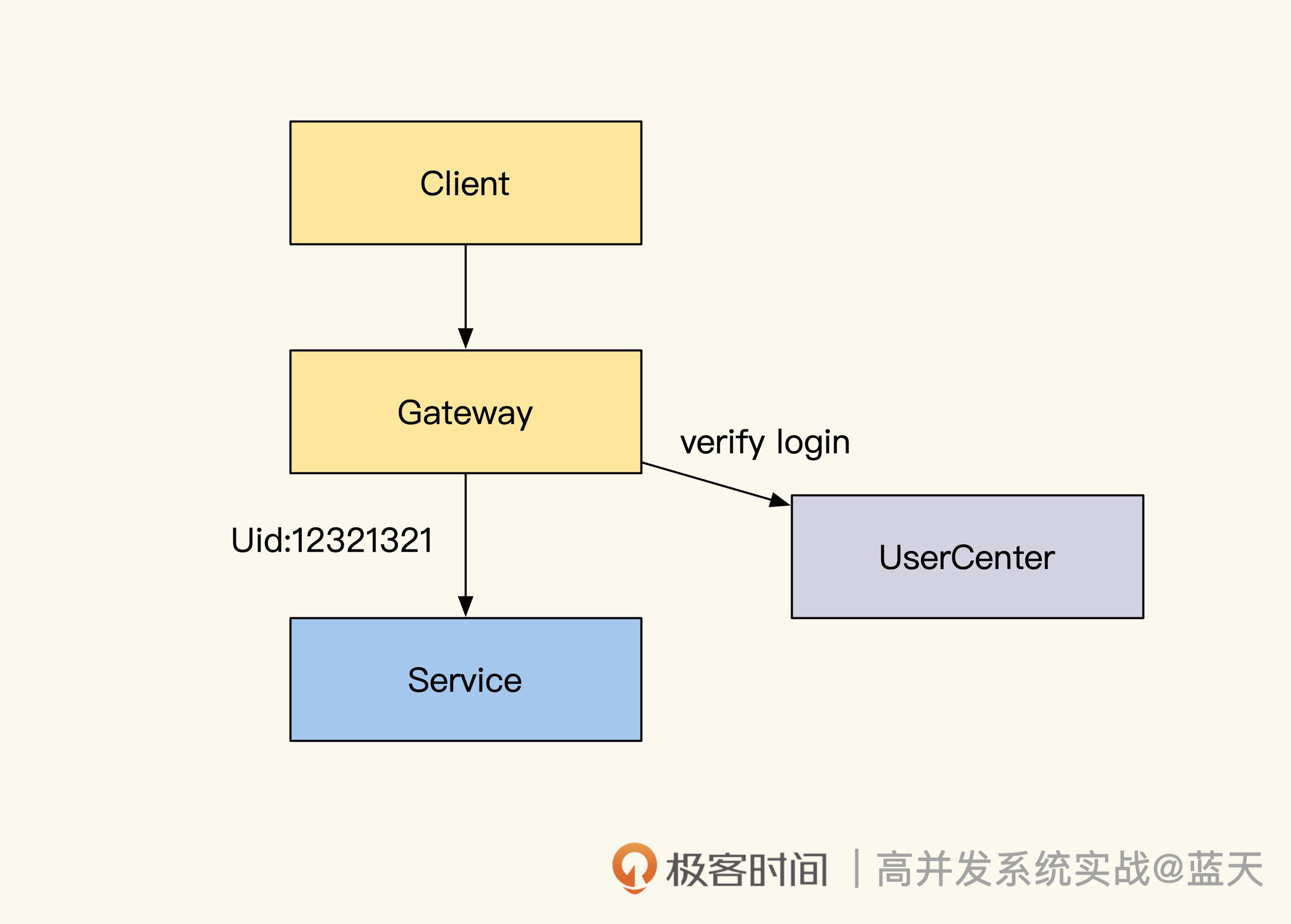 那么除了使用SDK以外,还有什么方式能够避免这种组件的耦合呢?这里我分享一种有趣的设计,那就是把用户登陆鉴权的功能放在网关。