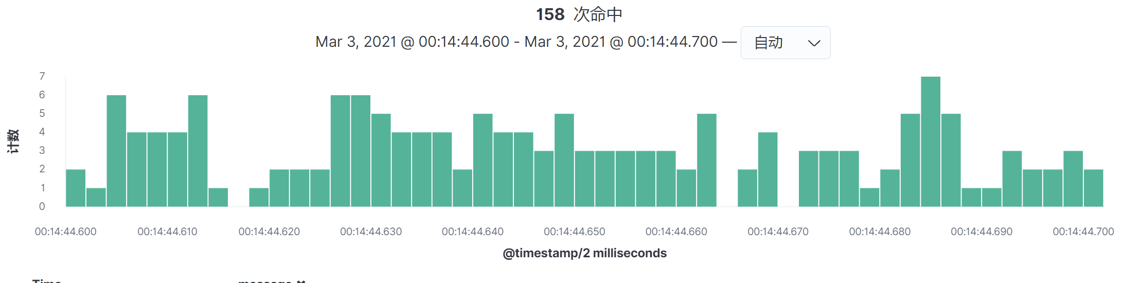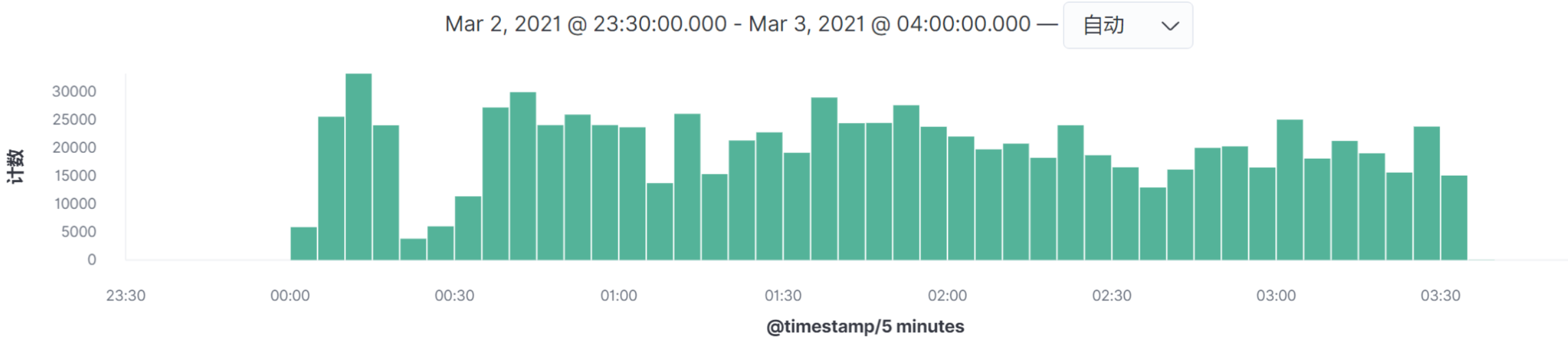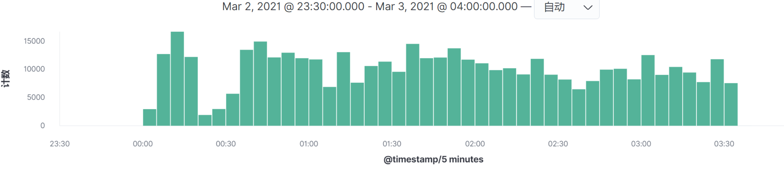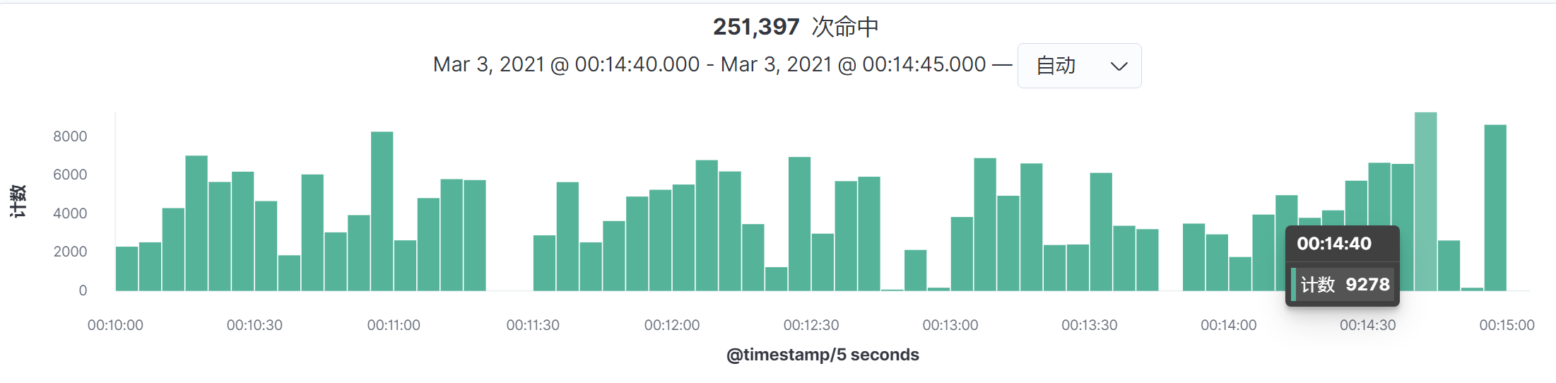 在查看ELFK中的数据时,建议你尽可能选择覆盖全部业务场景的时间段。比如说,我们要选择峰值时间段,一开始要选择时间段的范围设置大一些,这样才不会漏掉数据。然后再通过柱状图的高低做范围缩小。