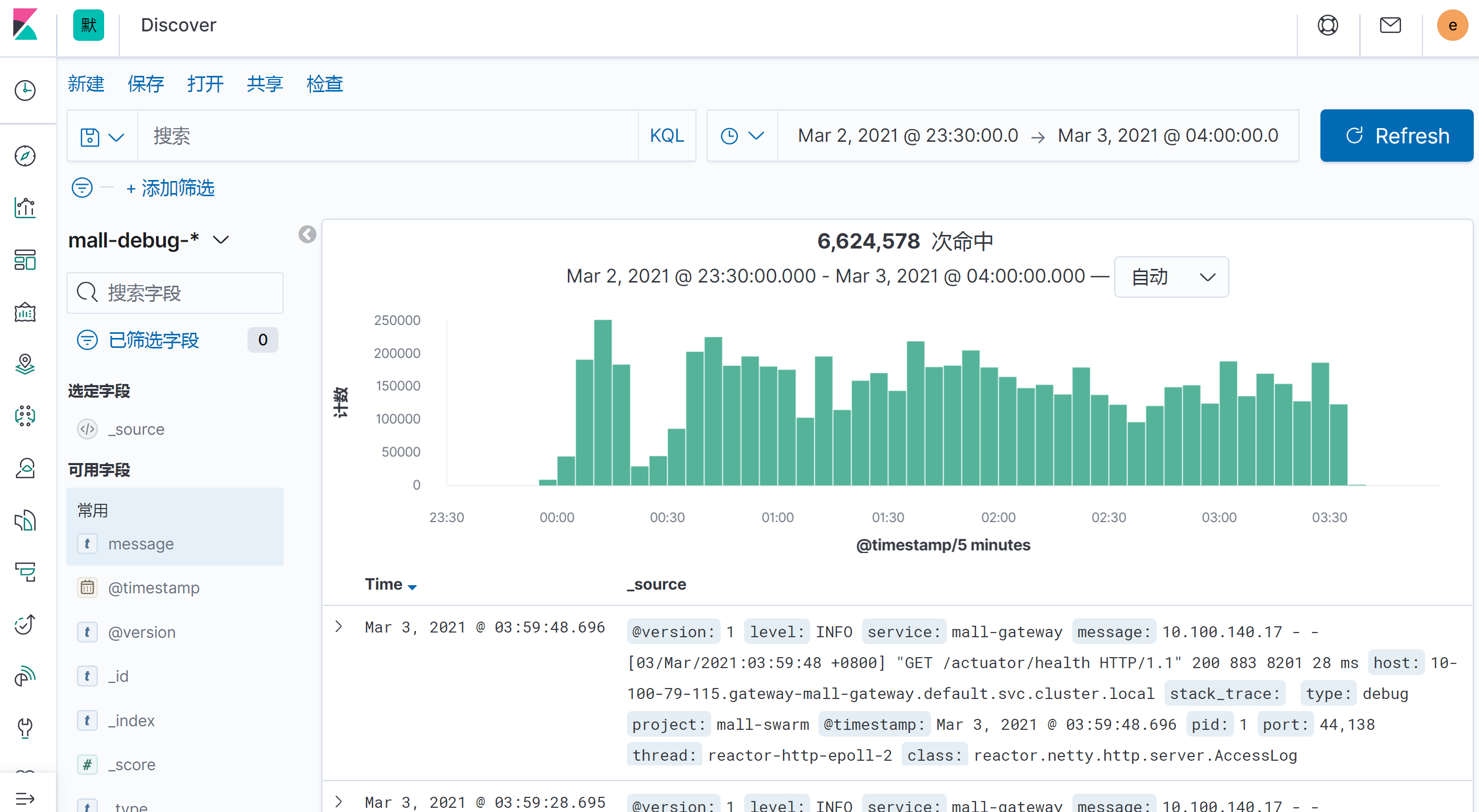 2. 配置好ELFK后,在Kibana的Discover界面就能看到收集的信息。注意,一条日志对应的就是一次命中。