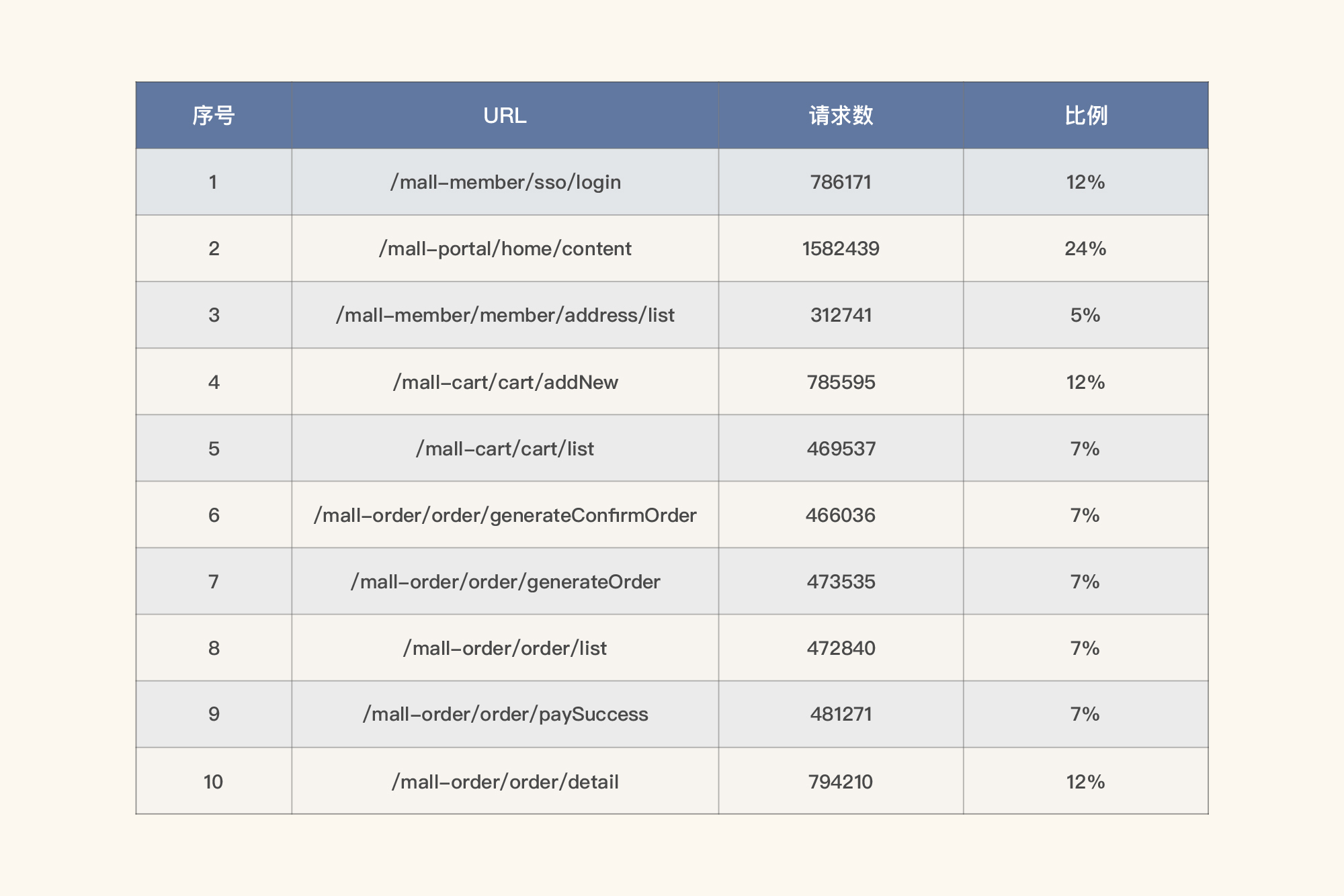 在我这个示例中,我们把数据量也列在表格中,同时求出比例关系,也就是拿某请求的数量除以总请求数,如下所示: