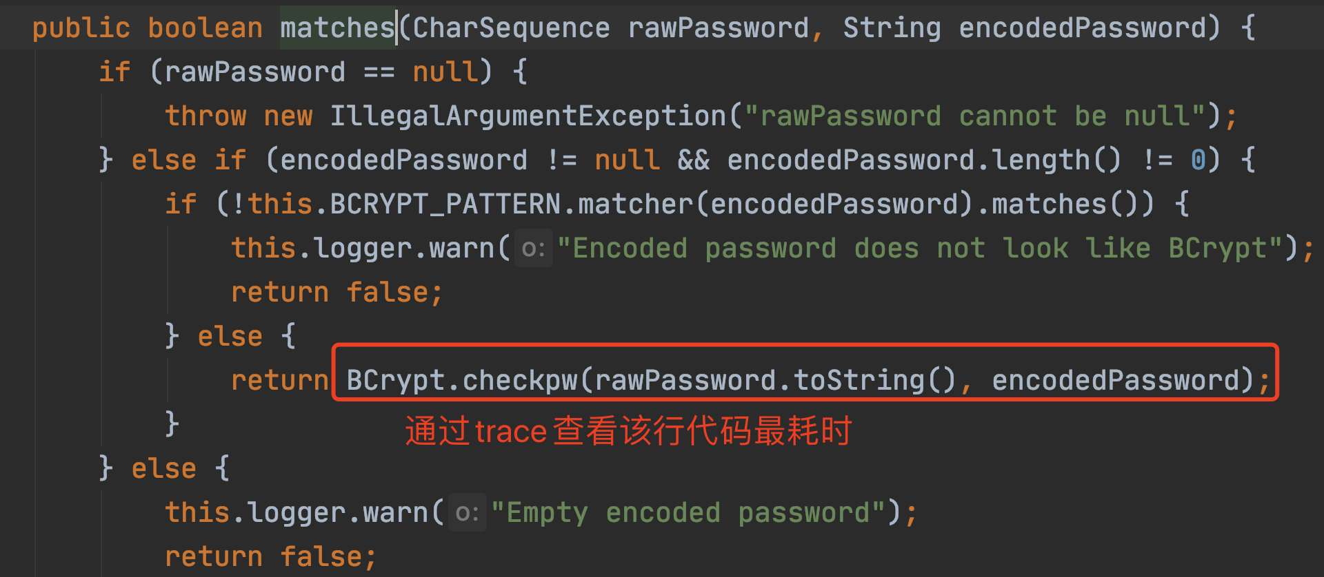 我们跟踪到这里,解决方案其实比较明确了,那就是用更快的加密方式,或者去掉这个加密算法。我们把更换加密方式这个问题留给开发去解决。作为性能分析人员,我决定把这个加密算法直接去掉,咱们先往下走。