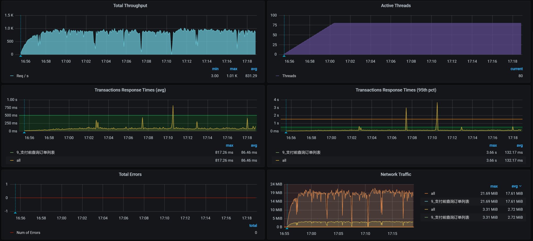 对于支付前查询订单列表接口,我们先来看第一次运行的性能场景结果: